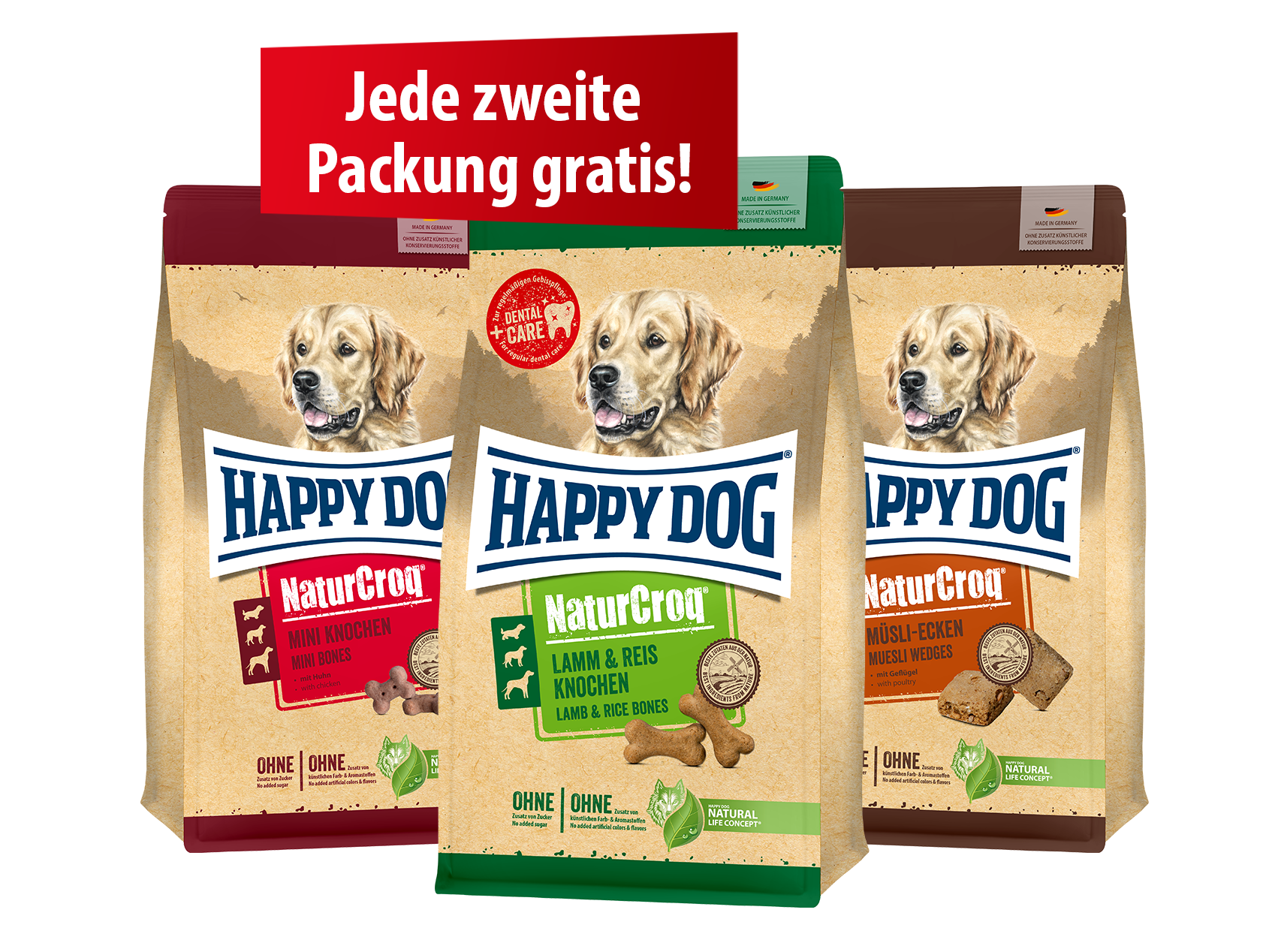 • Erhalte jetzt zu deiner Bestellung unserer Happy Dog NaturCroq Backsnacks 500 g jede zweite Packung gratis!*