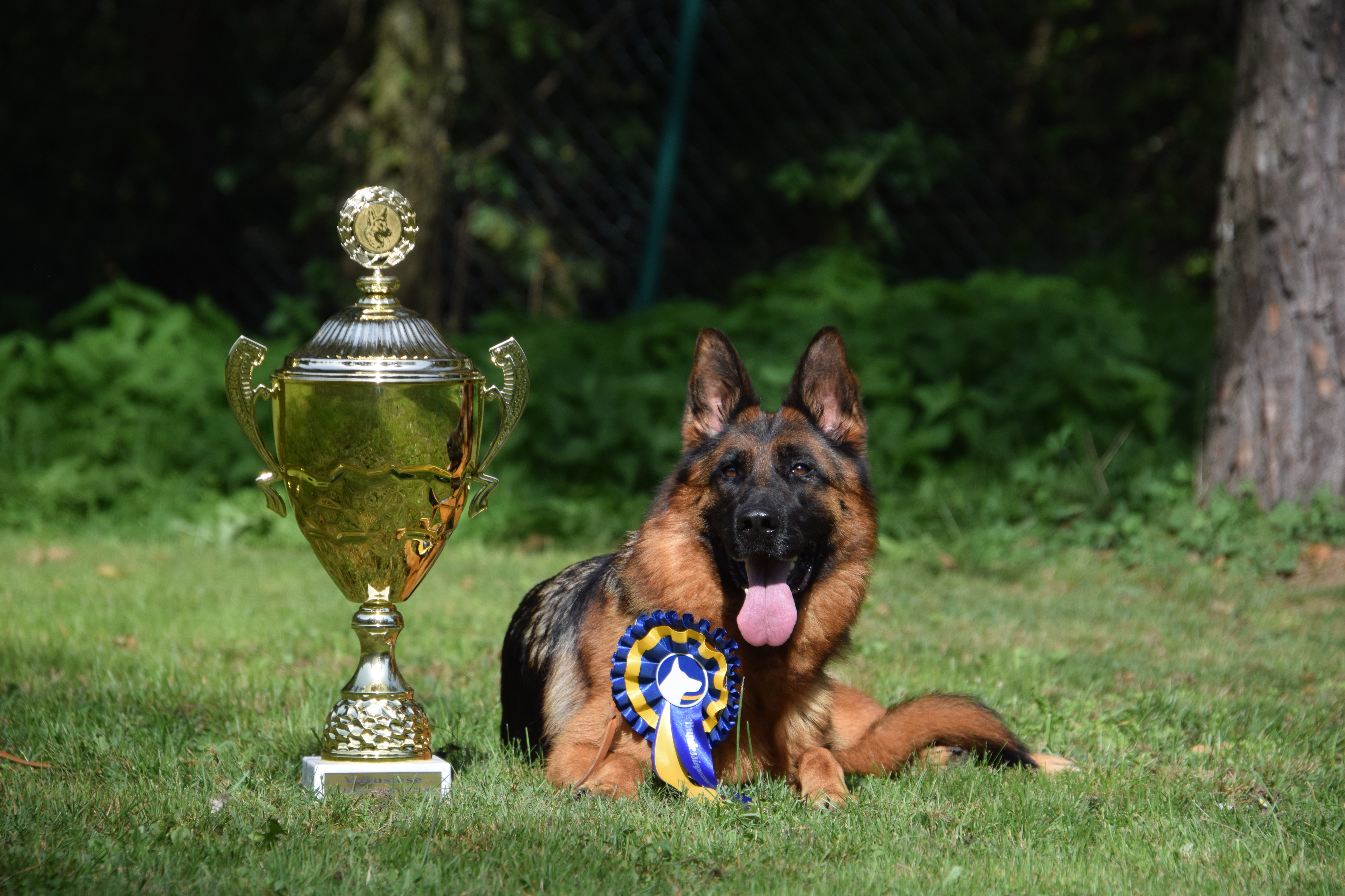 Odin steht vor einem Sonnenblumenfeld und schleckt sich das Maul