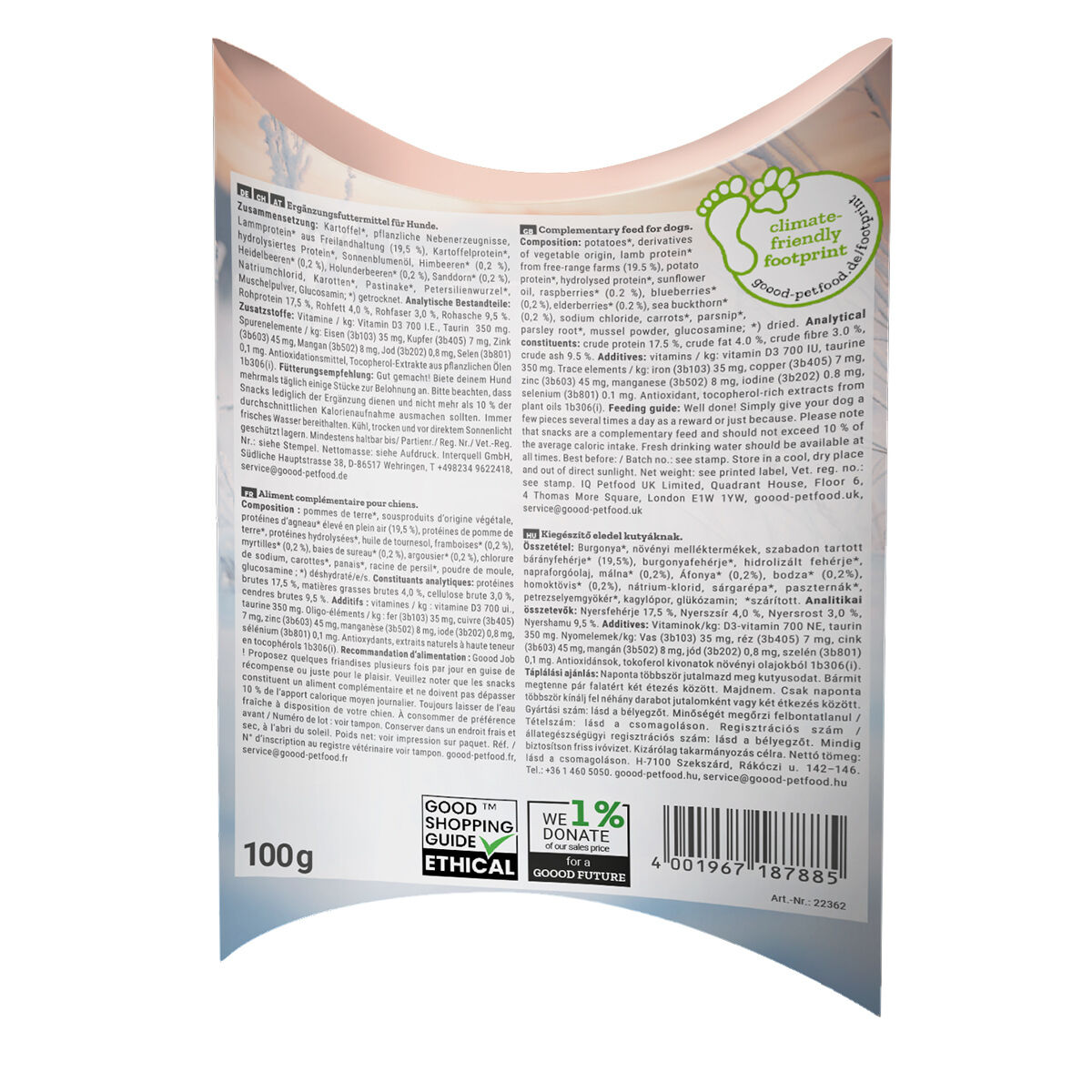 Kartoffel*, pflanzliche Nebenerzeugnisse, Lammprotein* aus Freilandhaltung (19,5 %), Kartoffelprotein*, hydrolysiertes Protein*, Sonnenblumenöl, Himbeeren* (0,2 %), Heidelbeeren* (0,2 %), Holunderbeeren* (0,2 %), Sanddorn* (0,2 %), Natriumchlorid, Karotten*, Pastinake*, Petersilienwurzel*, Muschelpulver, Glucosamin.