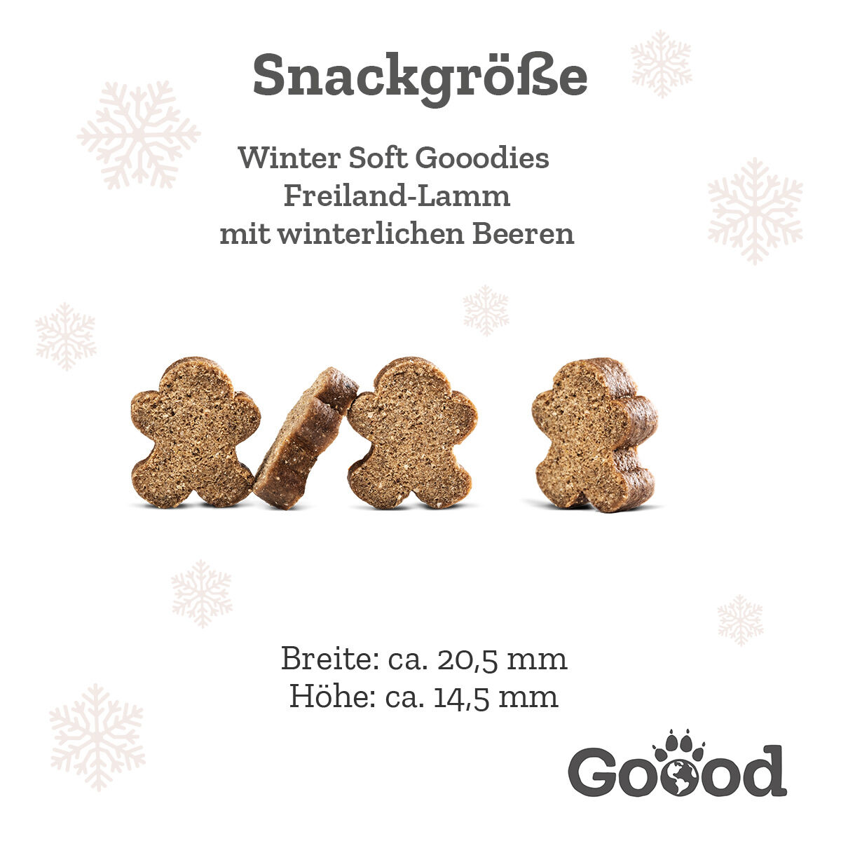 Die winterlichen Snacks sind nicht nur lecker, sondern auch getreidefrei und daher besonders gut verträglich für Hunde mit sensiblen Mägen oder Allergien. Die hochwertige Rezeptur enthält wertvolle Proteine, die aus sorgfältig ausgewähltem Freiland-Lammfleisch stammen. Unsere Winter Snacks werden in einer niedlichen Lebkuchenmännchen-Form gebacken und eignen sich bestens für Vierbeiner aller Rassen und Größen. Ob als Belohnung oder einfach zwischendurch – die Goood Winter Gooodies sind immer eine gute Wahl. Dabei kannst du sicher sein, dass du deinem Hund nur das Beste gibst, denn die Leckerlis enthalten keine künstlichen Konservierungsstoffe, Farb- oder Aromastoffe.