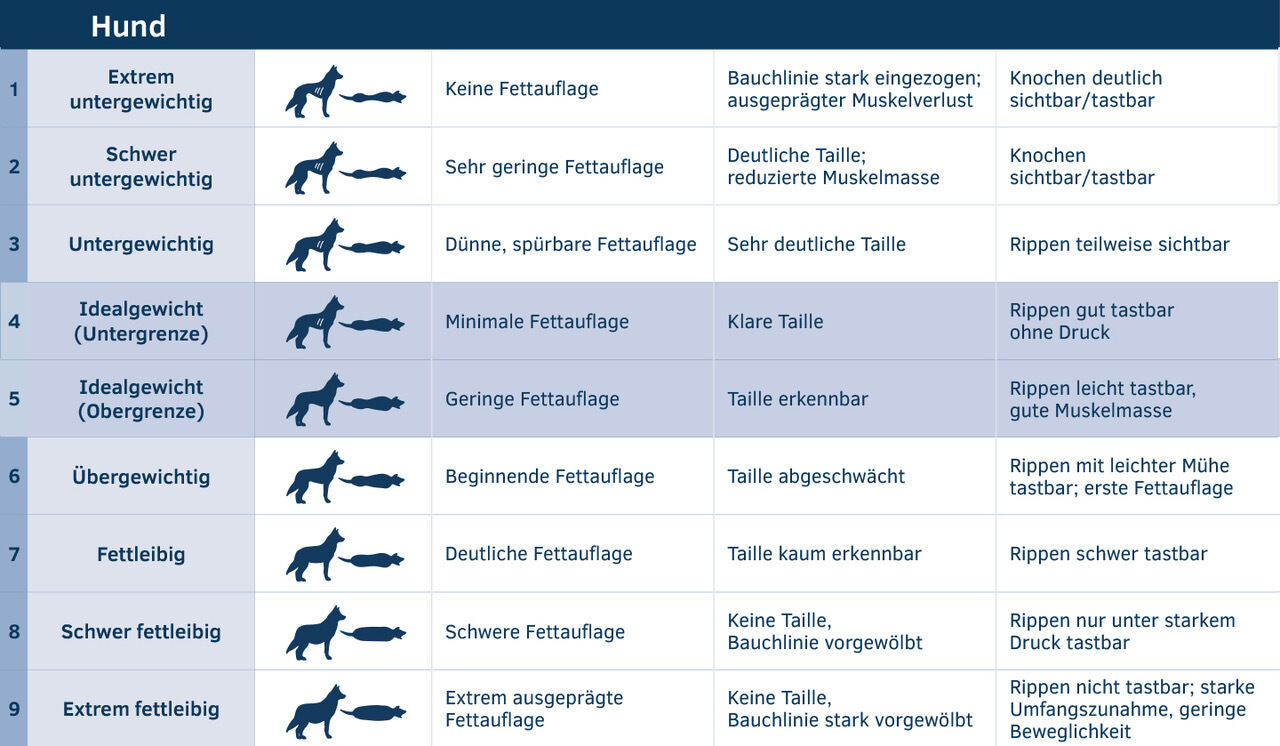 Eine gute Methode, die dir bzw. dem Tierarzt dabei hilft, herauszufinden, ob dein Hund Übergewicht hat oder normalgewichtig ist, ist der Body Condition Score. Mit Hilfe des Body Condition Scores kann der Gewichtsstatus des eigenen Tieres ermittelt werden. Der BCS ist nur für erwachsene Hunde geeignet. Bei Welpen und Junghunden orientierst du dich besser an der Wachstumskurve.