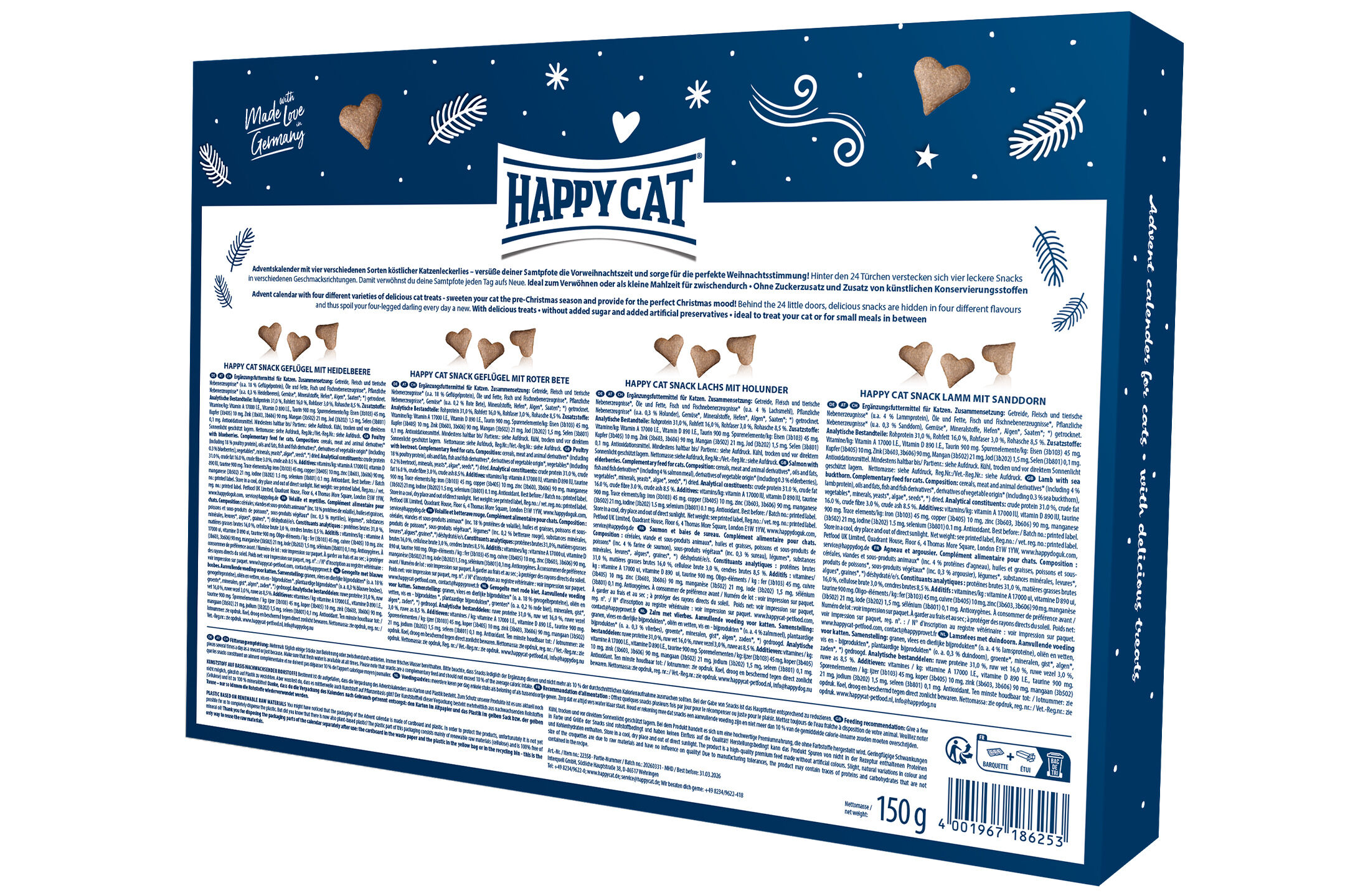 In der festlichen Vorweihnachtszeit gesellt sich zu Plätzchen und Punsch ein weiterer Brauch – der Adventskalender. Auch unsere geliebten Samtpfoten kommen mit dem bezaubernden Happy Cat Adventskalender in den Genuss der weihnachtlichen Tradition. Vom 1. bis zum 24. Dezember dürfen sie sich täglich auf eine köstliche Überraschung freuen. Hinter den Türchen warten schmackhafte Leckerlis, die selbst für empfindliche Katzen bestens geeignet sind. Tag für Tag darf sich deine Samtpfote an verwöhnenden Snacks in Herzform erfreuen, die Vielfalt an Geschmacksrichtungen sorgt dabei für anhaltende Abwechslung. Übersicht des Adventskalenders: