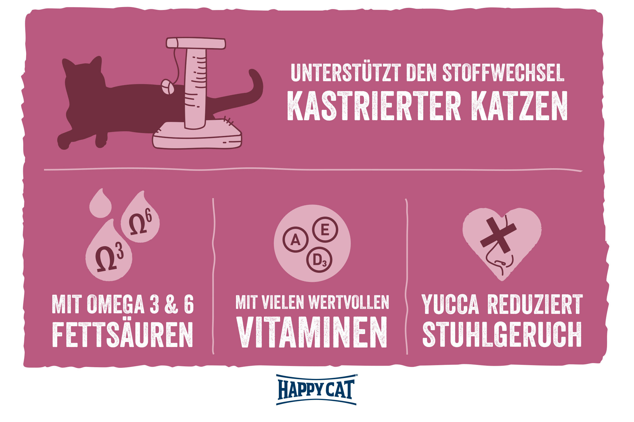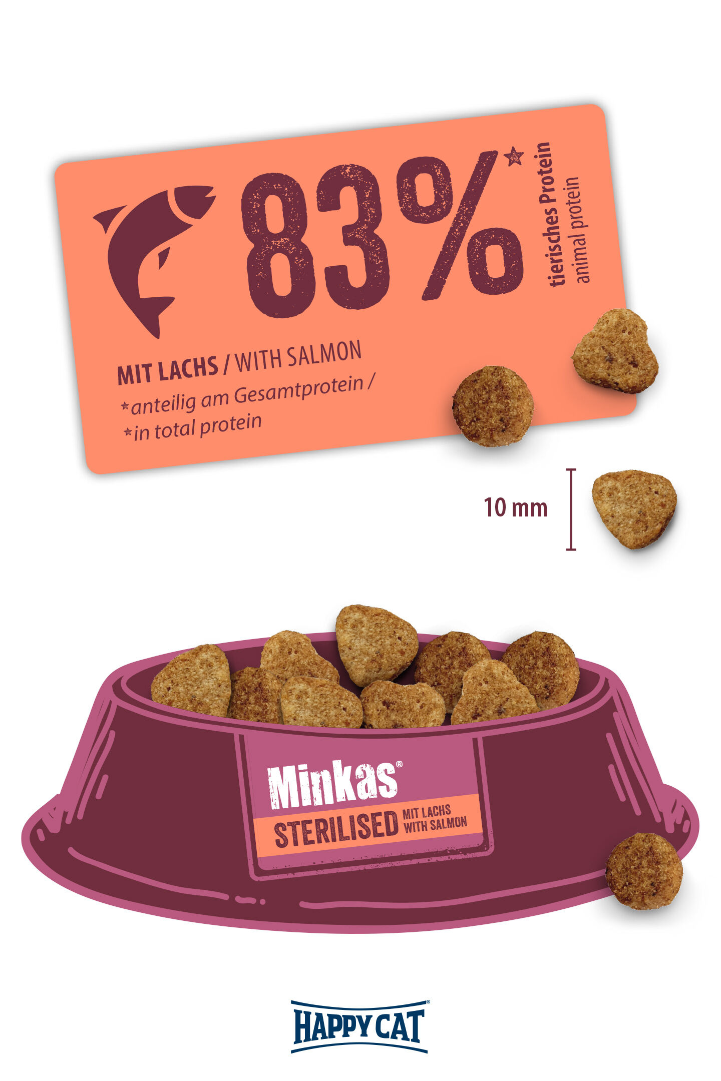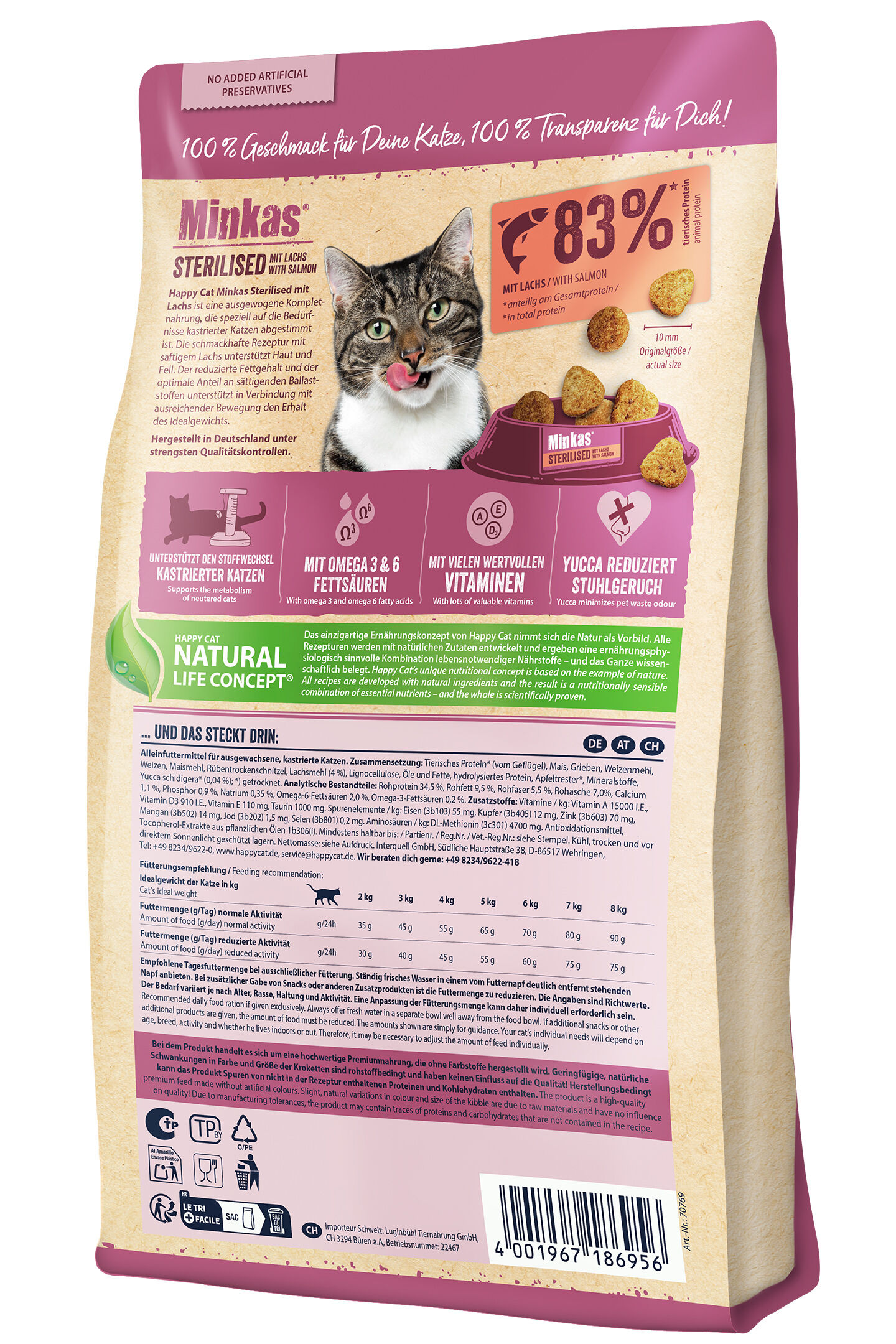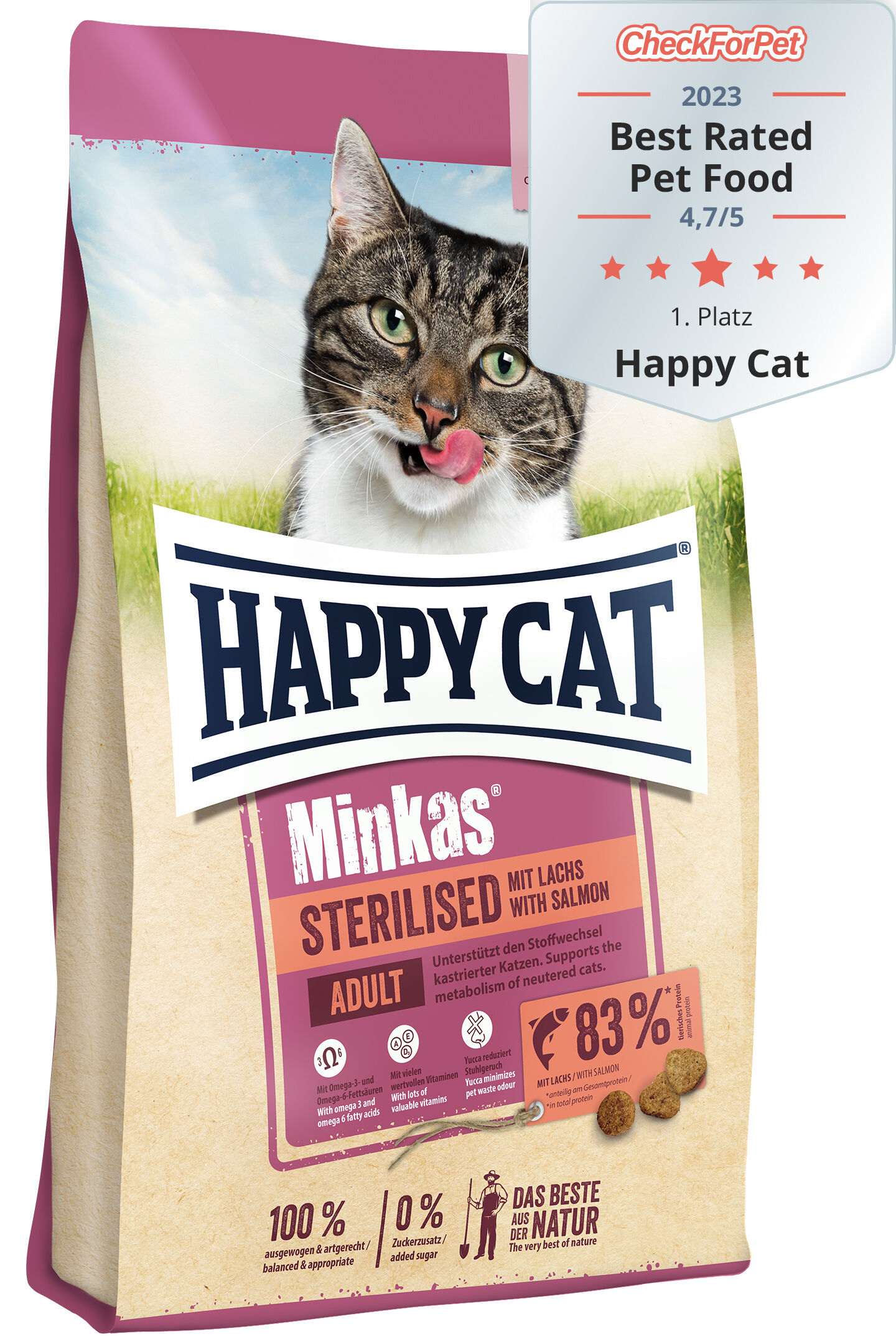 Happy Cat Minkas Sterilised mit Lachs ist ein gutes Trockenfutter, das speziell auf die Bedürfnisse kastrierter Katzen mit reduziertem Energiebedarf abgestimmt ist. Da sich der Stoffwechsel sterilisierter Katzen und kastrierter Kater verändert und sie sich zudem nach der Kastration meist weniger bewegen als vorher, empfehlen wir auf das Gewicht kastrierter Katzen zu achten. In der Regel benötigen Kastraten weniger Energie als unkastrierte Artgenossen. Daher ist Happy Cat Minkas Sterilised mit Lachs optimal für kastrierte Tiere geeignet. Ein reduzierter Fettgehalt in Kombination mit dem Zusatz sättigender Ballaststoffe sorgt nämlich dafür, dass deine Katze satt wird und zwar bei vollem Geschmack, aber weniger Fett. So kann dieses Katzenfutter effektiv zur Gewichtskontrolle beitragen und hilft, das Idealgewicht deiner Katze zu erhalten - besonders bei weniger Aktivität nach der Kastration.